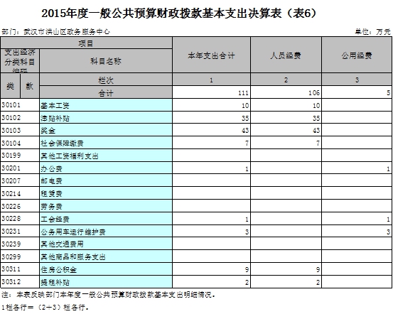 2015度一般公共预算财政拨款基本支出111万元,其中,人员经费105万元,主要包括:基本工资、津贴补贴、奖金、社会保障缴费、绩效工资、其他工资福利支出、离休费、退休费、抚恤金、退职(役)费、抚恤金、生活补助、救济费、医疗费、助学金、奖励金、生产补贴、住房公积金、提租补贴、购房补贴、其他对个人和家庭的补助支出;公用经费5万元,主要包括:办公费、印刷费、邮电费、差旅费、维修(护)费、租赁费、培训费、专用材料费、被装购置费、专用燃料费、工会经费、福利费、公务用车运行维护费、其他交通费用、税金及附加费用、其他商品和服务支出;基本建设和其他资本性支出1万元,主要包括:办公设备购置、专用设备购置、其他基本建设支出。