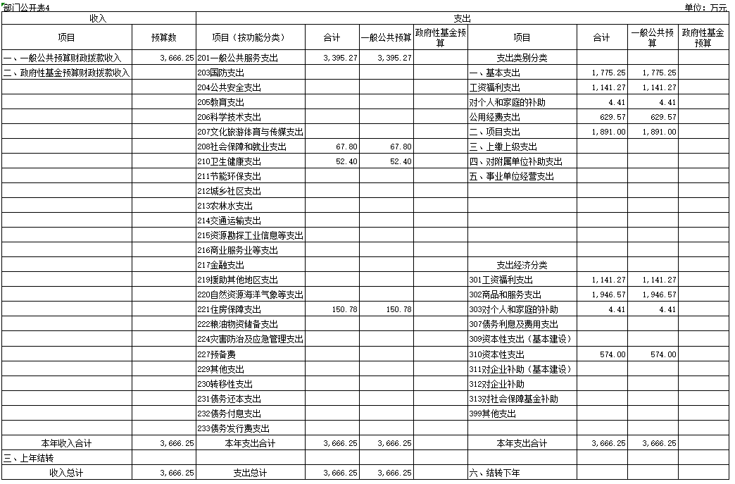 一般公共预算财政拨款收入 3666.25 万元,支出 3666.25    万元,预算收支平衡。
