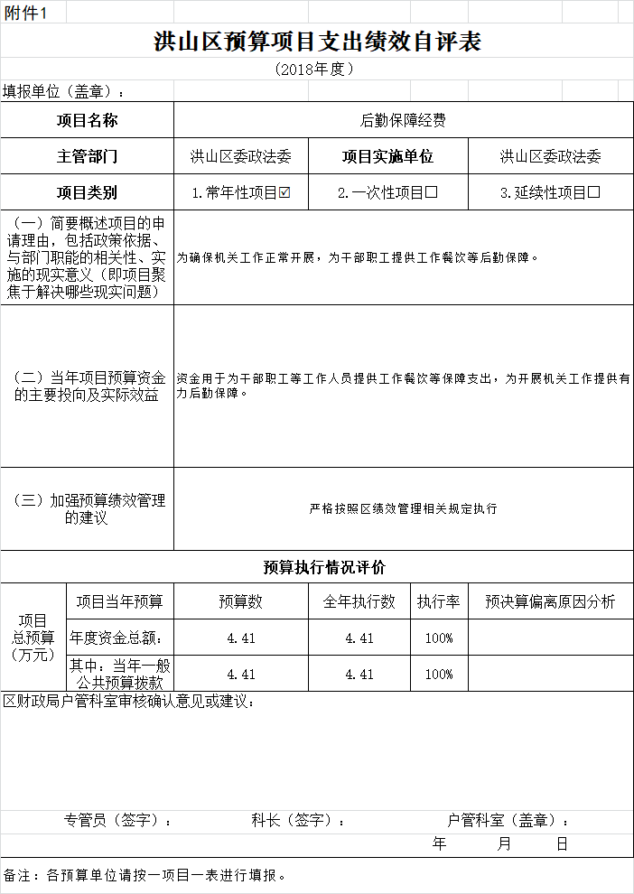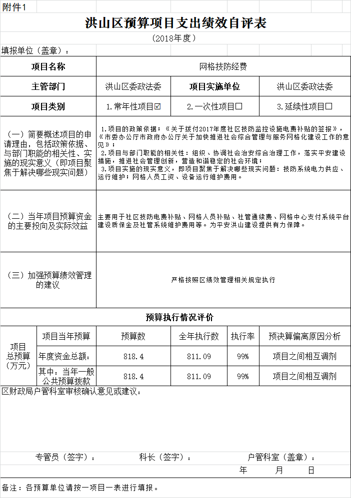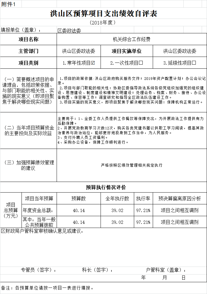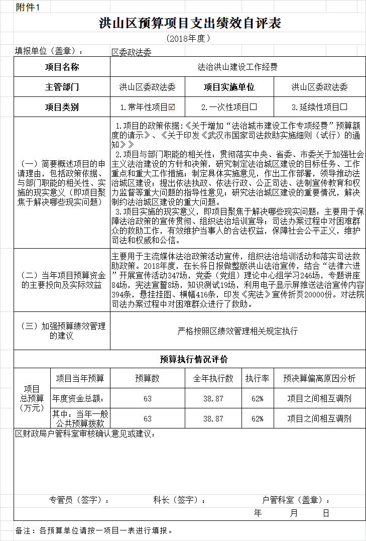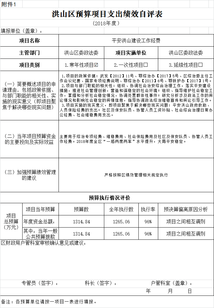 (武汉市洪山政法委员会项目支出绩效自评报告见附件)