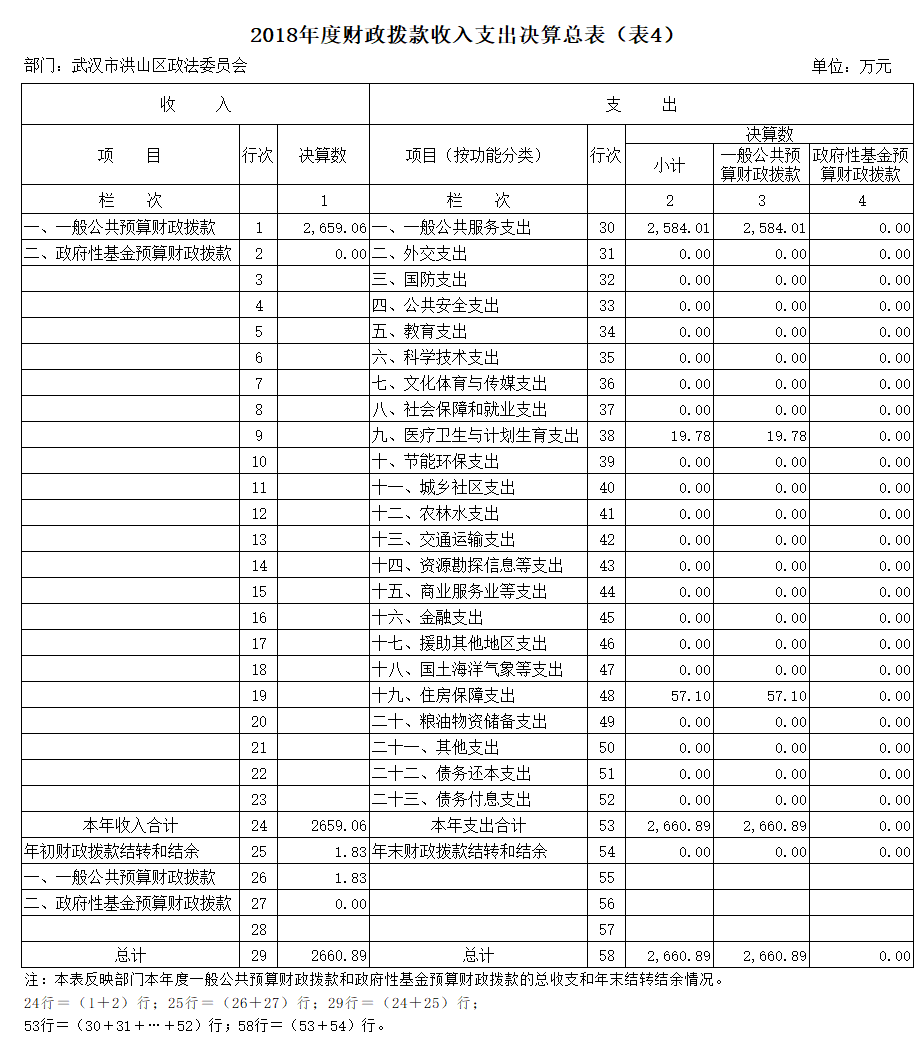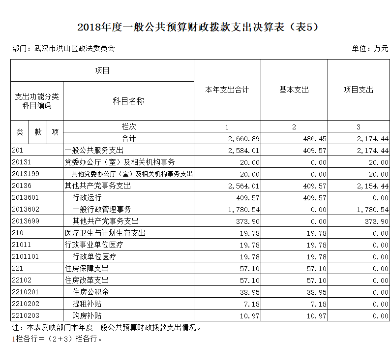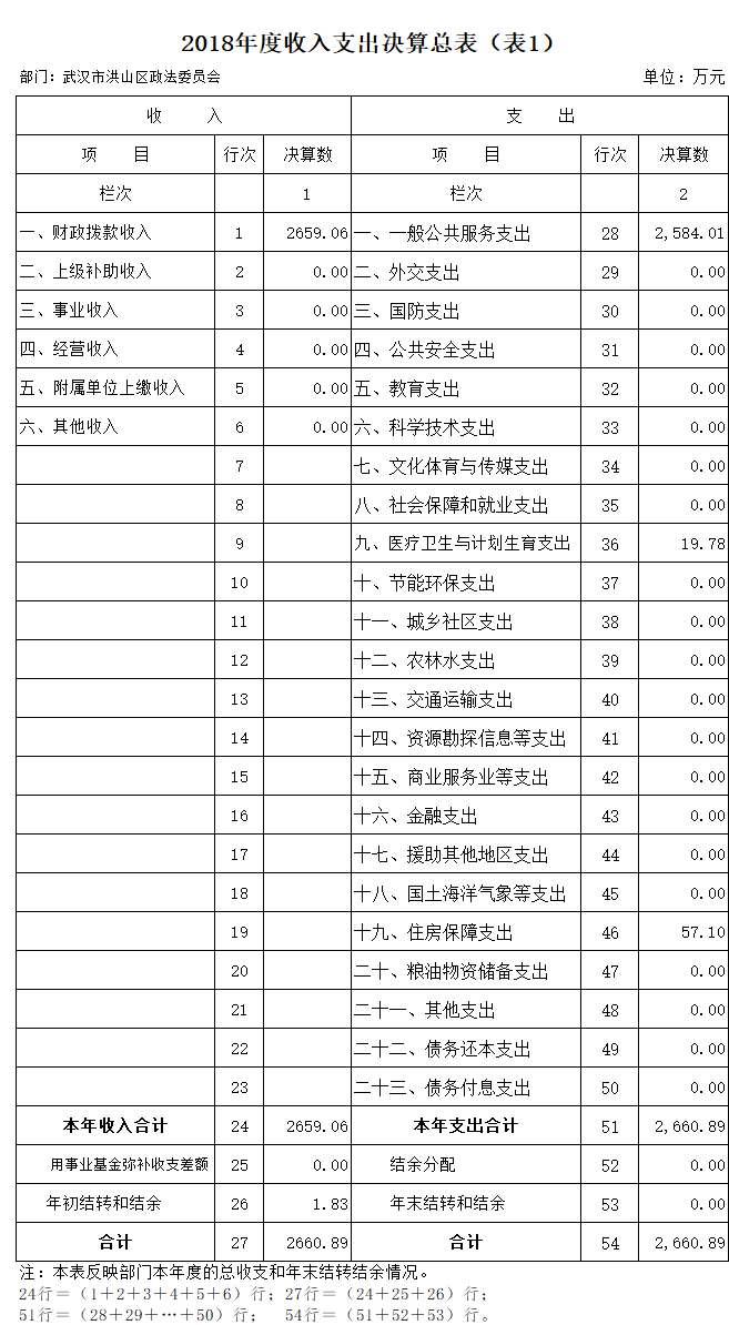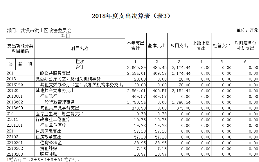 2018年一般公共预算财政拨款支出年初预算为2721.5万元,支出决算为2660.89万元,完成年初预算的97.77%。其中:基本支出486.45万元,项目支出2174.44万元。项目支出主要用于法治洪山建设工作经费38.87万元,主要用于主流媒体法治政策活动宣传,组织法治培训活动和落实司法救助政策;机关综合工作经费39.02万元,主要用于全委工作人员提供工作餐饮等保障支出,为开展政法工作提供有力后勤保障;平安洪山建设工作经费1265.06万元,主要用于综治专项经费、维稳费用、社会保险费用及社区及保安队员、协管人员工作经费;网格技防经费811.09万元,主要用于社区技防电费补贴、网格人员补贴、社管通续费、网格中心支付系统平台建设质保金及社管系统维护费用等;后勤保障经费4.41万元,资金用于为干部职工等工作人员提供工作餐饮等保障支出,为开展机关工作提供有力后勤保障。