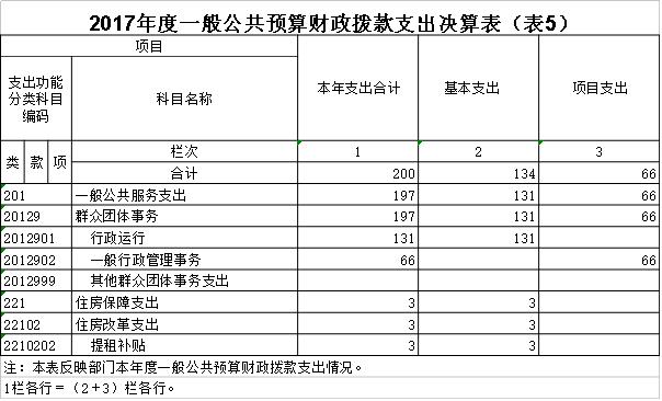 2017年度财政拨款支出200万元,主要用于以下方面:一般公共服务(类)支出197万元,占98.50%;住房保障支出3万元,占1.50%。