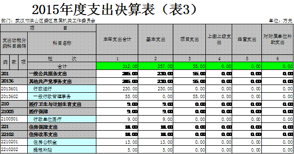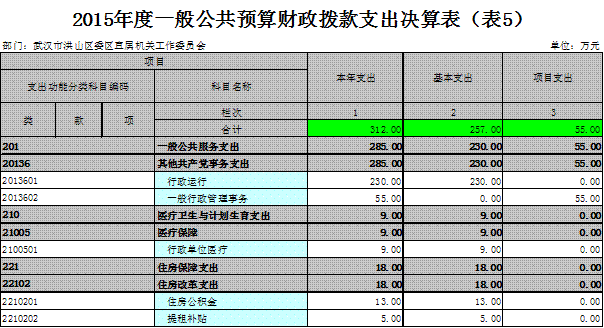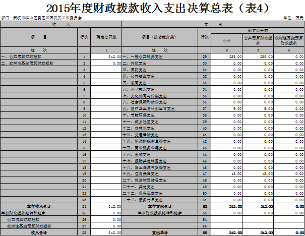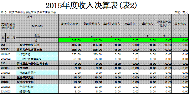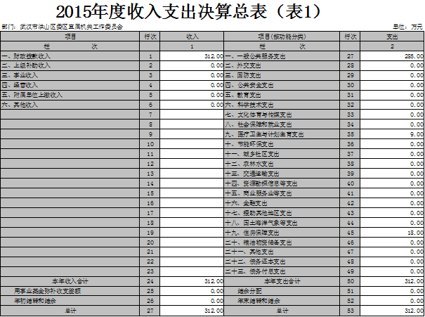 2015年度收入总计312万元,支出总计312万元。与2014年相比,收入增加43万元,增长16%,主要原因是工资福利支出增加。支出增加43万元,增长16%,主要原因是工资福利支出增加。