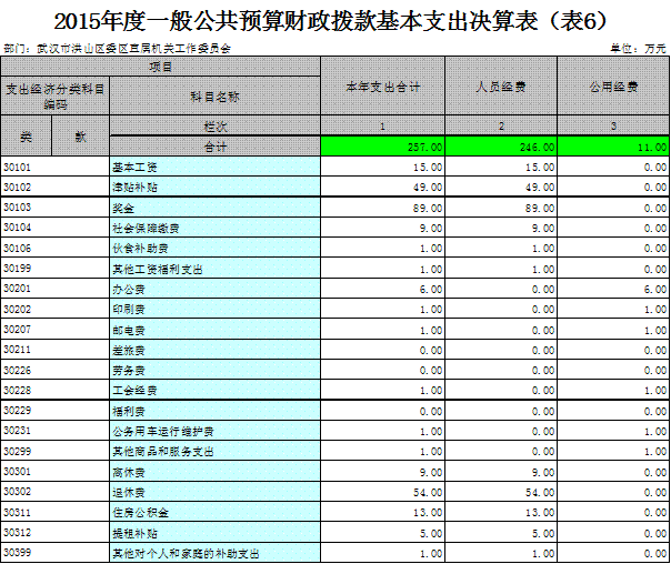 2015度一般公共预算财政拨款基本支出257万元,其中,人员经费246万元,主要包括:基本工资、津贴补贴、奖金、社会保障缴费、绩效工资、其他工资福利支出、离休费、退休费、抚恤金、退职(役)费、抚恤金、生活补助、救济费、医疗费、助学金、奖励金、生产补贴、住房公积金、提租补贴、购房补贴、其他对个人和家庭的补助支出;公用经费11万元,主要包括:办公费、印刷费、咨询费、手续费、水费、电费、邮电费、取暖费、物业管理费、差旅费、因公出国(境)费、维修(护)费、租赁费、会议费、培训费、公务接待费、专用材料费、被装购置费、专用燃料费、劳务费、委托业务费、工会经费、福利费、公务用车运行维护费、其他交通费用、税金及附加费用、其他商品和服务支出;基本建设和其他资本性支出1万元,主要包括:房屋建筑构建费、办公设备购置、专用设备购置、基础设施建设、大型修缮、信息网络及软件购置更新、物资储备、土地补偿、安置补助、地上附着物和青苗补助、拆迁补偿、公务用车购置、其他交通工具购置、其他基本建设和资本性支出。