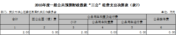 2015年度“三公”经费财政拨款年度预算为6.75万元,支出决算为2万元,完成预算的30%。其中: