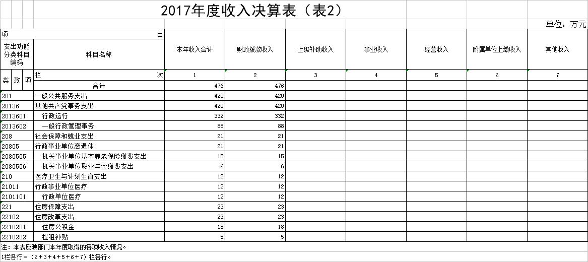 2017年度本年收入合计476万元。其中:财政拨款收入476万元,占本年收入100.00%。