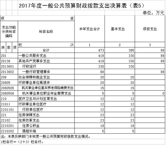 2017年度本年支出合计473万元。其中:基本支出385万元,占本年支出81.40%;项目支出88万元,占本年支出18.60%。