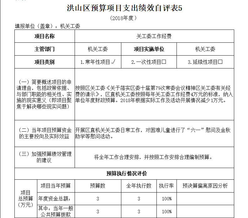 关工委工作经费项目绩效自评综述:项目全年预算数为3.00万元,执行数为3.00万元,完成预算的100%。主要产出和效果:开展区直机关关工委日常工作,对困难儿童进行了“六一”慰问及金秋助学等慰问活动。发现的问题及原因:预算编制不够细化。下一步改进措施:将全年工作合理安排,并按照工作安排合理编制预算。