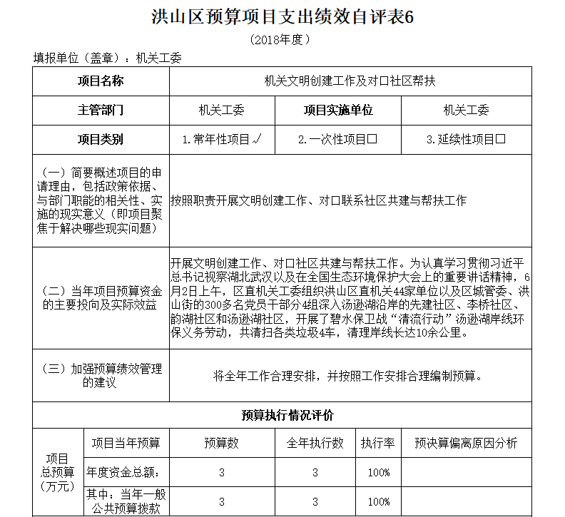 机关文明创建工作及对口社区帮扶项目绩效自评综述:项目全年预算数为3.00万元,执行数为3.00万元,完成预算的100%。主要产出和效果:开展文明创建工作、对口社区共建与帮扶工作。为认真学习贯彻习近平总书记视察湖北武汉以及在全国生态环境保护大会上的重要讲话精神,区直机关工委组织黄色网址 直机关44家单位以及区城管委、洪山街的300多名党员干部分4组深入汤逊湖沿岸的先建社区、李桥社区、韵湖社区和汤逊湖社区,开展了碧水保卫战“清流行动”汤逊湖岸线环保义务劳动,共清扫各类垃圾4车,清理岸线长达10余公里。发现的问题及原因:预算编制不够细化。下一步改进措施:将全年工作合理安排,并按照工作安排合理编制预算。