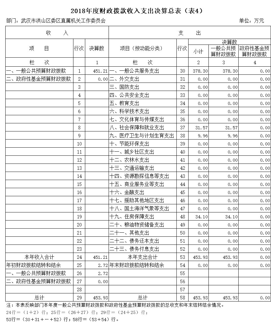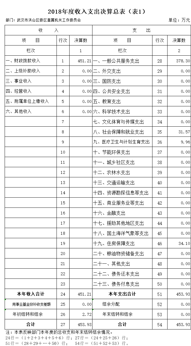 2018年度收、支总计453.93万元。与2017年相比,收、支总计各减少22.07万元,降低4.64%,主要原因是退休人员异动调整,基本支出减少。