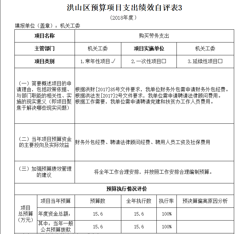 购买劳务支出项目绩效自评综述:项目全年预算数为15.60万元,执行数为15.60万元,完成预算的100%。主要产出和效果:用于财务外包经费、聘请法律顾问经费、聘用人员工资及社保费用。发现的问题及原因:预算编制不够细化。下一步改进措施:将全年工作合理安排,并按照工作安排合理编制预算。