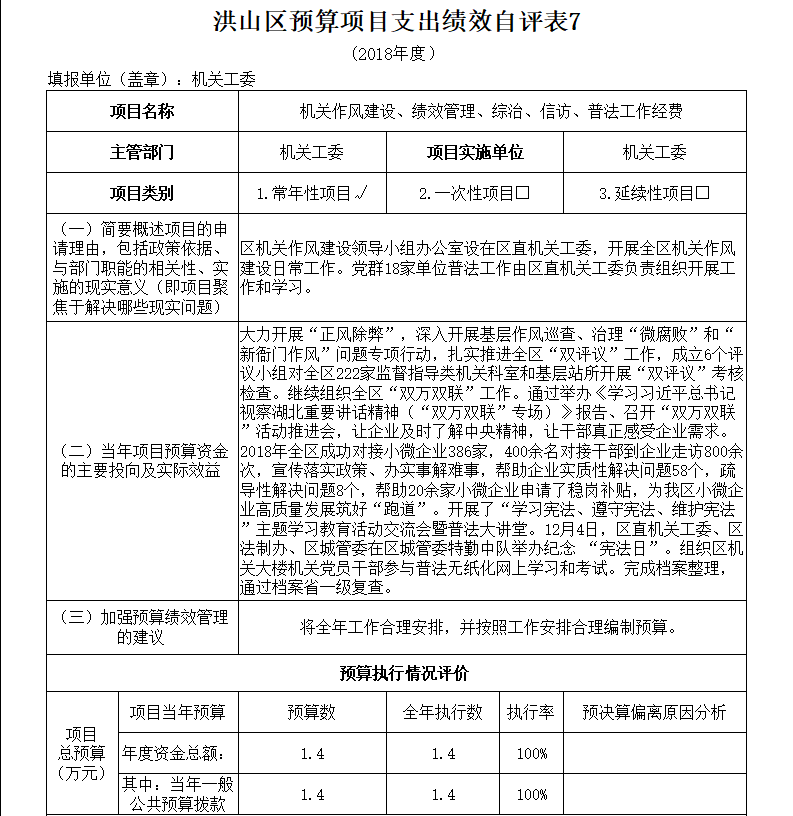 机关作风建设、绩效管理、综治、信访、普法工作经费项目绩效自评综述:项目全年预算数为1.40万元,执行数为1.40万元,完成预算的100%。主要产出和效果:大力开展“正风除弊”,深入开展基层作风巡查、治理“微腐败”和“新衙门作风”问题专项行动,扎实推进全区“双评议”工作,成立6个评议小组对全区222家监督指导类机关科室和基层站所开展“双评议”考核检查。继续组织全区“双万双联”工作。通过举办《学习习近平总书记视察湖北重要讲话精神(“双万双联”专场)》报告、召开“双万双联”活动推进会,让企业及时了解中央精神,让干部真正感受企业需求。2018年全区成功对接小微企业386家,400余名对接干部到企业走访800余次,宣传落实政策、办实事解难事,帮助企业实质性解决问题58个,疏导性解决问题8个,帮助20余家小微企业申请了稳岗补贴,为我区小微企业高质量发展筑好“跑道”。开展了“学习宪法、遵守宪法、维护宪法”主题学习教育活动交流会暨普法大讲堂。12月4日,区直机关工委、区法制办、区城管委在区城管委特勤中队举办纪念 “宪法日”。组织区机关大楼机关党员干部参与普法无纸化网上学习和考试。完成档案整理,通过档案省一级复查。发现的问题及原因:预算编制不够细化。下一步改进措施:将全年工作合理安排,并按照工作安排合理编制预算。