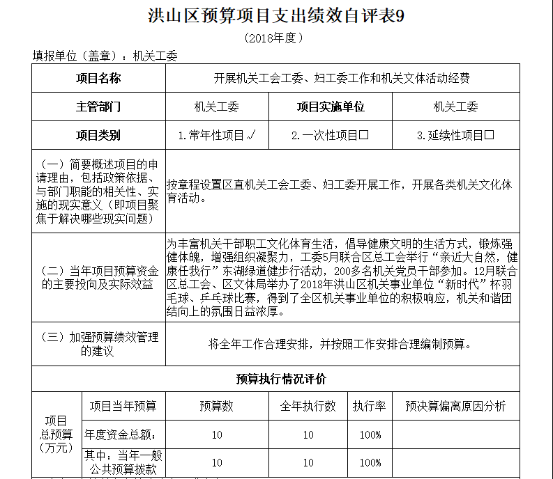 开展机关工会工委、妇工委工作和机关文体活动经费项目绩效自评综述:项目全年预算数为10.00万元,执行数为10.00万元,完成预算的100%。主要产出和效果:为丰富机关干部职工文化体育生活,倡导健康文明的生活方式,锻炼强健体魄,增强组织凝聚力,工委5月联合区总工会举行“亲近大自然,健康任我行”东湖绿道健步行活动,200多名机关党员干部参加。12月联合区总工会、区文体局举办了2018年黄色网址 机关事业单位“新时代”杯羽毛球、乒乓球比赛,得到了全区机关事业单位的积极响应,机关和谐团结向上的氛围日益浓厚。发现的问题及原因:预算编制不够细化。下一步改进措施:将全年工作合理安排,并按照工作安排合理编制预算。