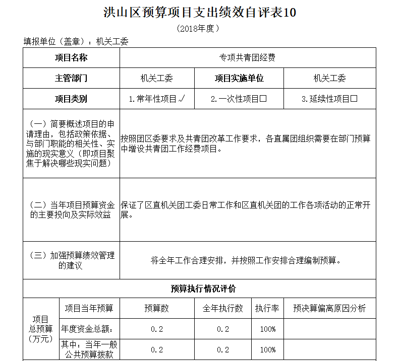 专项共青团经费项目绩效自评综述:项目全年预算数为0.20万元,执行数为0.20万元,完成预算的100%。主要产出和效果:保证了区直机关团工委日常工作和区直机关团的工作各项活动的正常开展。发现的问题及原因:预算编制不够细化。下一步改进措施:将全年工作合理安排,并按照工作安排合理编制预算。