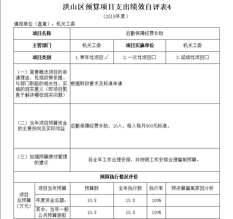 后勤保障经费补助项目绩效自评综述:项目全年预算数为2.94万元,执行数为2.94万元,完成预算的100%。主要产出和效果:用于本单位人员后勤保障经费。发现的问题及原因:预算编制不够细化。下一步改进措施:将全年工作合理安排,并按照工作安排合理编制预算。