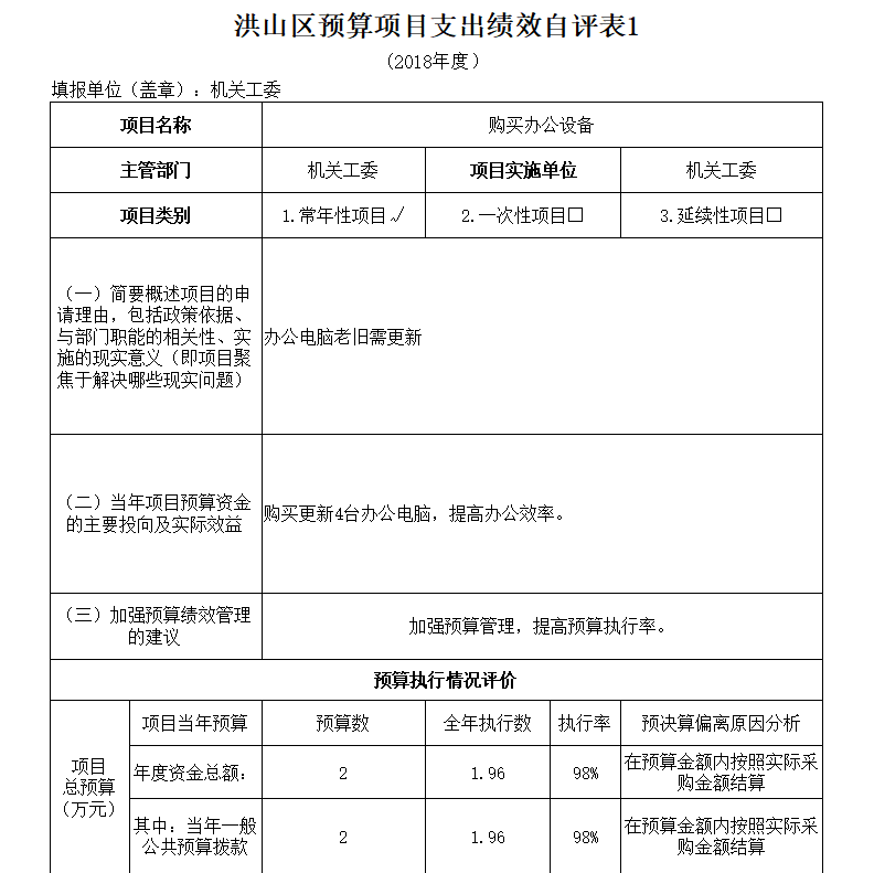 办公设备购置项目绩效自评综述:项目全年预算数为2万元,执行数为1.96万元,完成预算的98%。主要产出和效果:购买更新4台办公电脑,提高办公效率。发现的问题及原因:预算编制不够准确,经费测算与实际支出情况有偏差。下一步改进措施:加强预算管理,提高预算执行率。