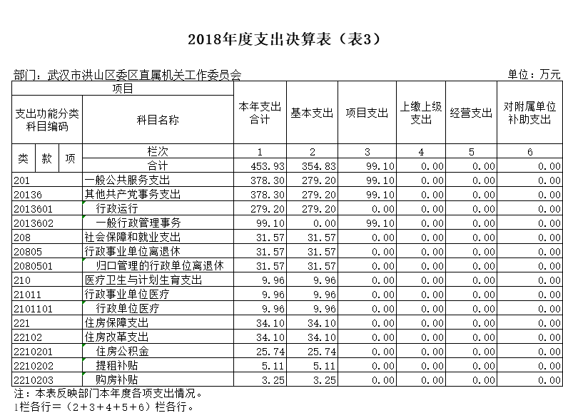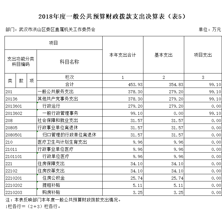 2018年一般公共预算财政拨款支出年初预算为554.07万元,支出决算为453.93万元,完成年初预算的81.93%。其中:基本支出354.83万元,项目支出99.10万元。项目支出主要用于:(1)办公设备购置 1.96万元,用于办公设备更新购置等;(2)党建工作经费(含纪检)22.00万元,用于区直机关党的建设工作规划、调研;党员学习教育;举办机关大讲堂、知识竞赛、报告会、读书征文等活动组织费用;区直机关党员发展对象、党务干部培训会务组织、资料印制、老师授课费用等;党风廉政建设学习、宣传、教育、培训资料、会务组织、党务公开督促指导、违纪案件办理;在职及老干部党支部活动开展等;(3)购买劳务支出15.60万元,用于聘请法律顾问、财务外包、聘用人员工资及社保;(4)后勤保障经费补助2.94万元,用于后勤保障经费补助;(5)关工委工作经费3.00万元,用于区直机关关工委日常工作和活动开展;(6)机关文明创建工作及对口社区帮扶3.00万元,用于区直机关精神文明建设、“双创”工作开展及对口帮扶社区工作及慰问等;(7)机关作风建设、绩效管理、综治、信访、普法工作经费1.40万元,用于区机关作风建设工作领导小组办公室日常工作、暗访督查、市区两级基层评议机关、绩效满意度测评工作及区级绩效目标日常工作、资料整理、综治维稳、信访日常工作开展、综治对口社区联系;指导党群18家单位开展普法工作、举办普法讲座、组织普法考试、普法资料购买、会务组织;本单位档案整理、保管,机要保密法规宣传、学习、保密设备配备等;(8)精准扶贫工作经费39.00万元,用于区扶贫办日常工作开展、会务组织、扶贫慰问、购买租车服务等;(9)开展机关工会工委、妇工委工作和机关文体活动经费10.00万元,用于区直机关工会工委、妇委会日常工作、会务组织、学习培训以及开展相关活动、区直机关各项文体活动日常设备维护、场地租赁、活动组织等;(10)专项共青团经费0.20万元,用于区直机关团工委日常工作开展。