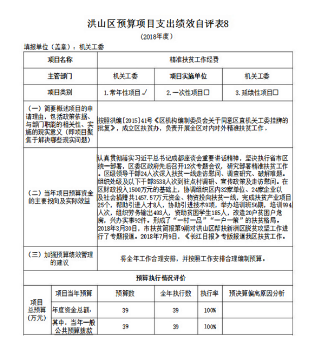 精准扶贫工作经费项目绩效自评综述:项目全年预算数为39.00万元,执行数为39.00万元,完成预算的100%。主要产出和效果:认真贯彻落实习近平总书记成都座谈会重要讲话精神,坚决执行省市区统一部署,区委区政府先后召开12次专题会议,研究部署精准扶贫工作。区级领导干部24人次深入扶贫一线走访慰问、调查研究、破解难题。组织处级及以下干部3538人次到驻点村调研、宣传政策及走访慰问。在区财政投入1500万元的基础上,协调组织区内32家单位、24家企业以及社会捐赠共1457.57万元资金、物资投向扶贫一线,完成扶贫产业项目25个,帮助引进人才8人,协助引进技术9项,举办培训班56期,培训994人次,组织劳务输出493人,资助贫困学生185人,改造20户贫困户危房,兴办实事92件。形成了“一村一品”“一户一策”的扶贫格局。2018年3月30日,市扶贫简报第9期对黄色网址 帮扶新洲区脱贫攻坚工作进行了专题报道。2018年7月9日,《长江日报》专版报道我区扶贫工作。发现的问题及原因:预算编制不够细化。下一步改进措施:将全年工作合理安排,并按照工作安排合理编制预算。