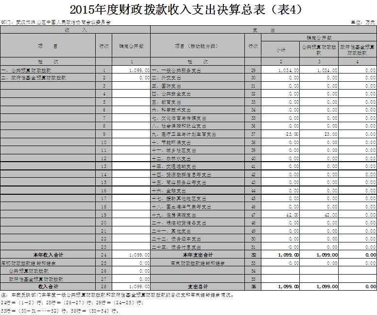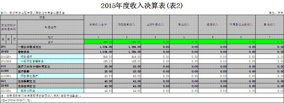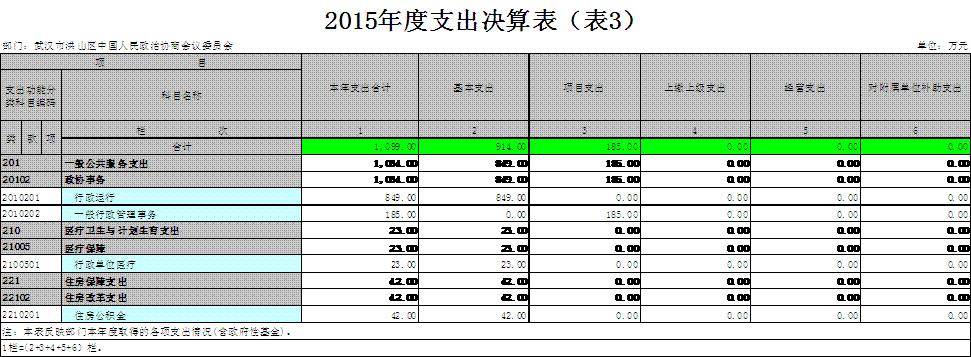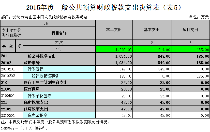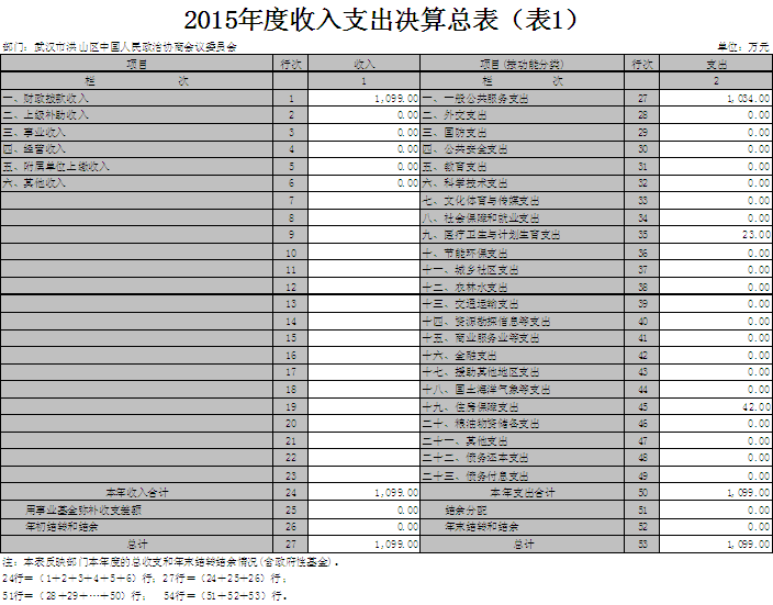 2015年度收入总计1,099万元,支出总计1,099万元。与2014年相比,收入增加53万元,增长5%,主要原因是基本支出有所增加。支出增加53万元,增长5%,主要原因是基本支出有所增加。