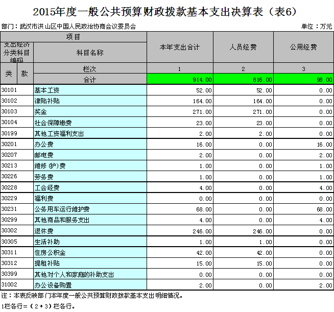 2015度一般公共预算财政拨款基本支出914万元,其中,人员经费816万元,主要包括:基本工资、津贴补贴、奖金、社会保障缴费、绩效工资、其他工资福利支出、离休费、退休费、抚恤金、退职(役)费、抚恤金、生活补助、救济费、医疗费、助学金、奖励金、生产补贴、住房公积金、提租补贴、购房补贴、其他对个人和家庭的补助支出;公用经费98万元,主要包括:办公费、印刷费、咨询费、手续费、水费、电费、邮电费、取暖费、物业管理费、差旅费、因公出国(境)费、维修(护)费、租赁费、会议费、培训费、公务接待费、专用材料费、被装购置费、专用燃料费、劳务费、委托业务费、工会经费、福利费、公务用车运行维护费、其他交通费用、税金及附加费用、其他商品和服务支出。