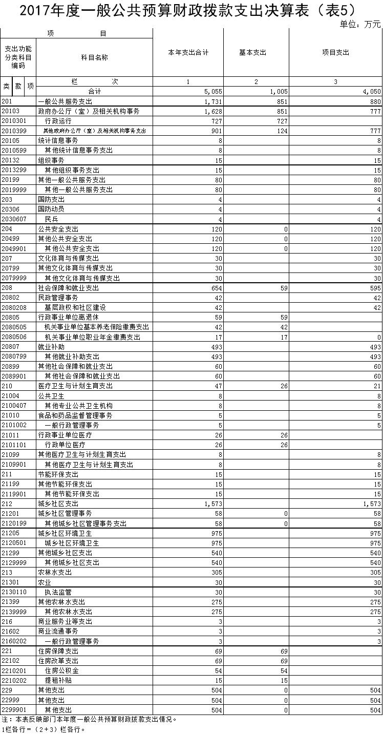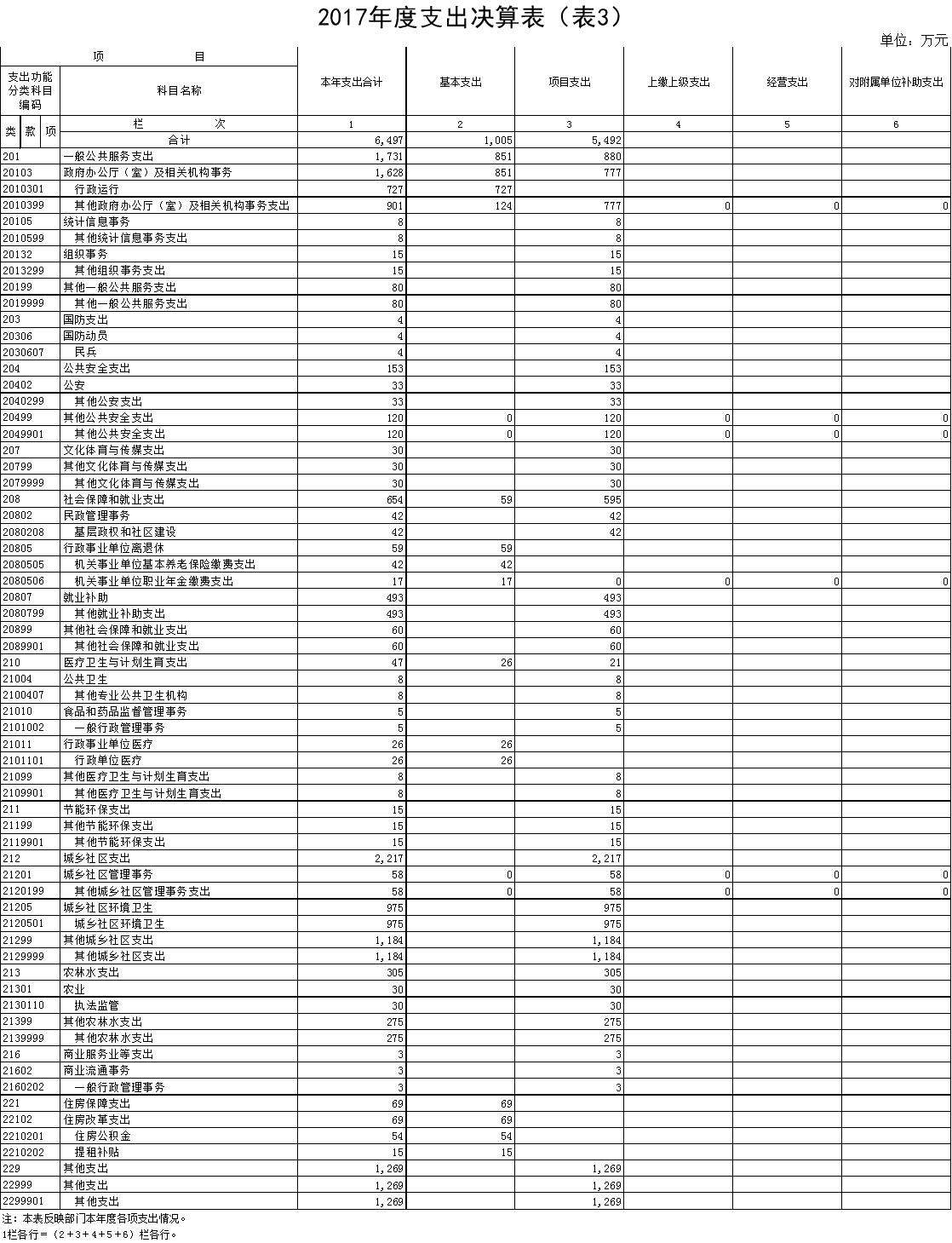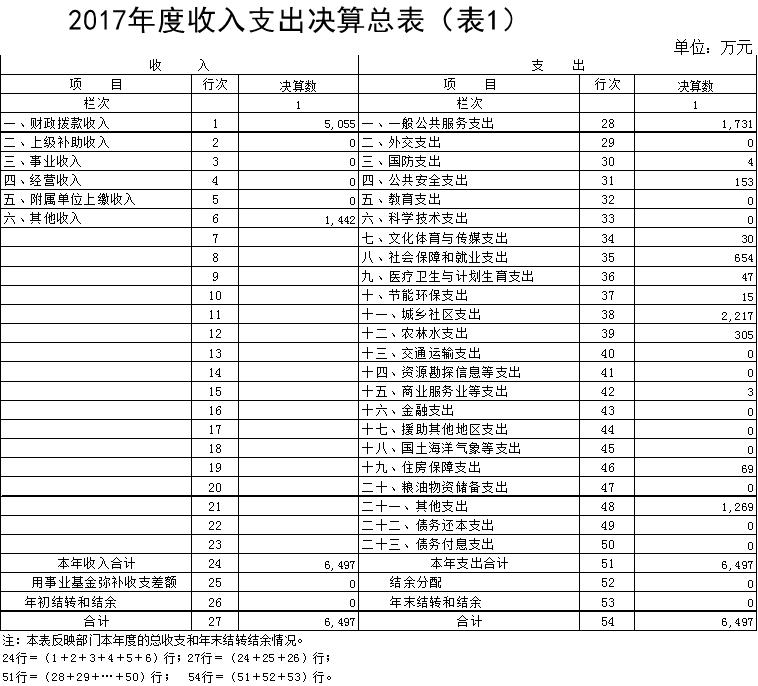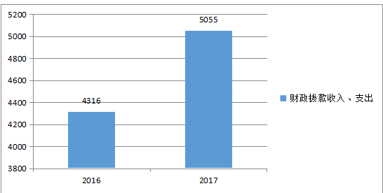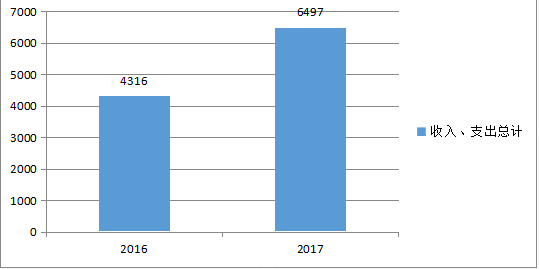 2017年度收、支总计6497万元。与2016年度相比,收、支总计各增加2181万元,增长50.53%,主要原因是人员支出调整,养老保险与职业年金缴纳,大城管专项和环卫专项经费增加。