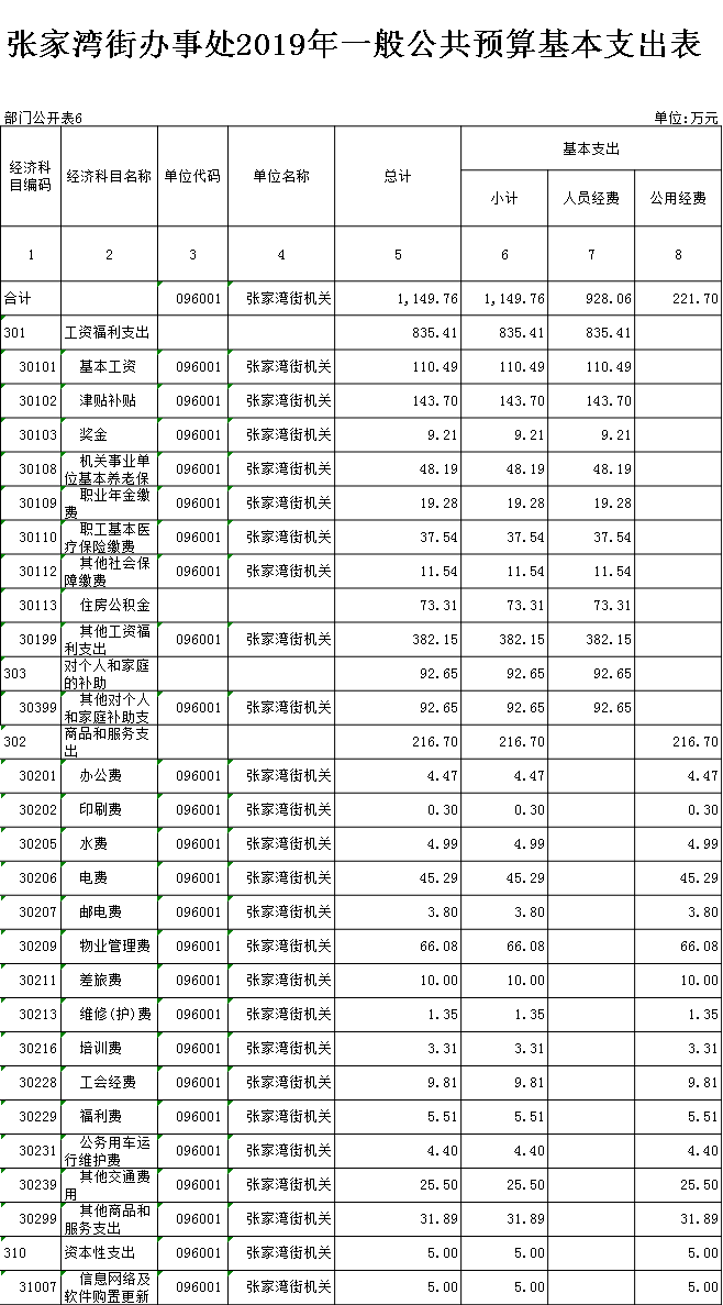 名 称:张家湾街办事处2019年一般公共预算基本支出表