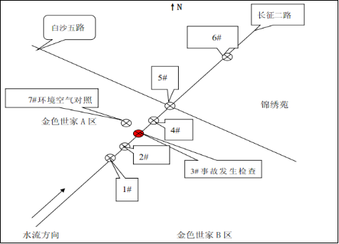 4#检查井位于事故井下游50m处,井深5m,井底存有少许积水,无明显水流,无底泥,氧气、氨气、甲烷、硫化氢浓度在安全范围内。