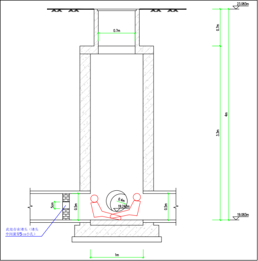 3#检查井为事故井,井深4m,井底存有少许积水,无明显水流,无底泥,氧气、氨气、甲烷浓度在安全范围内,硫化氢浓度超标,施工安全风险较大。