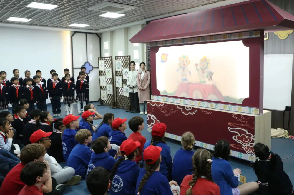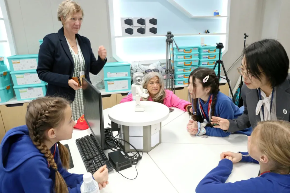 在一楼操场,孩子们通过趣味互动,快速熟悉校园各个角落;非遗中心里,英国师生领略皮影戏魅力,指尖操纵的皮影“阳阳”“袖袖”灵动如生,尽显民间艺术底蕴;五楼机器人教室中,中英学生围坐,见证机器人依语音指令完成趣味任务,彰显科技无国界的力量。