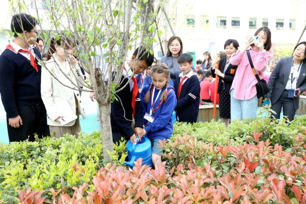 校园一角,中英学生一同种下友谊树,细心培土、浇水,挂上写满祝福的心愿牌。翠绿树苗扎根,象征中英友好情谊落地生根。