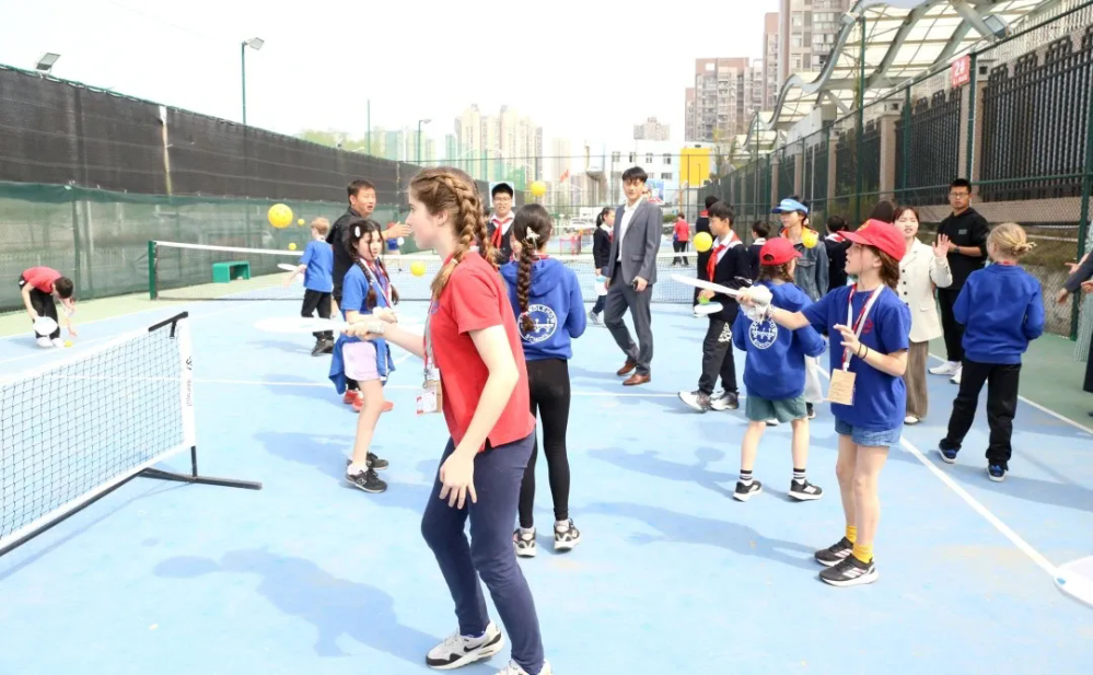体育互动热闹非凡。30名中英学生分组体验匹克球,在教练指导下学习发球、击球。你来我往的挥拍间,孩子们默契十足,笑声不断。随后,他们参与集体课间活动,互动愈发亲密,跨国友谊迅速升温。