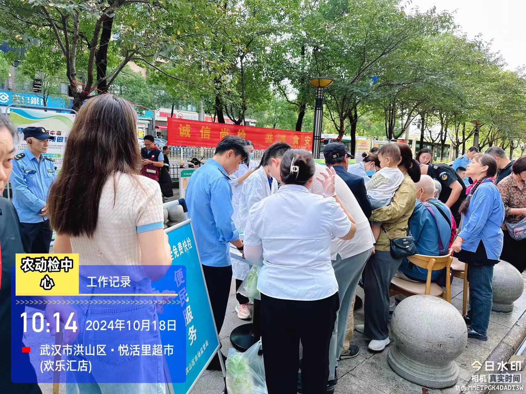 区发改局、洪山公安分局、区教育局、区市场监管局、区卫健局、区商务局、区疾控中心、洪山街社区卫生服务中心和区市场监管局农动中心等单位制作宣传展板,面向社区居民展示食品安全管理成效,发放食品安全宣传折叠页,引导社区居民厉行节约,爱惜粮食,合理饮食,维护身体健康。现场接受群众咨询,受理消费者投诉。区市场监管局安排了一辆食品快检车,为消费者现场提供蔬菜农残检测服务15批次,检测结果均为合格。区卫健局安排工作人员提供义诊服务,免费为73名社区居民量血压、测血糖,并提供小礼品,收到参与活动者的一致好评。