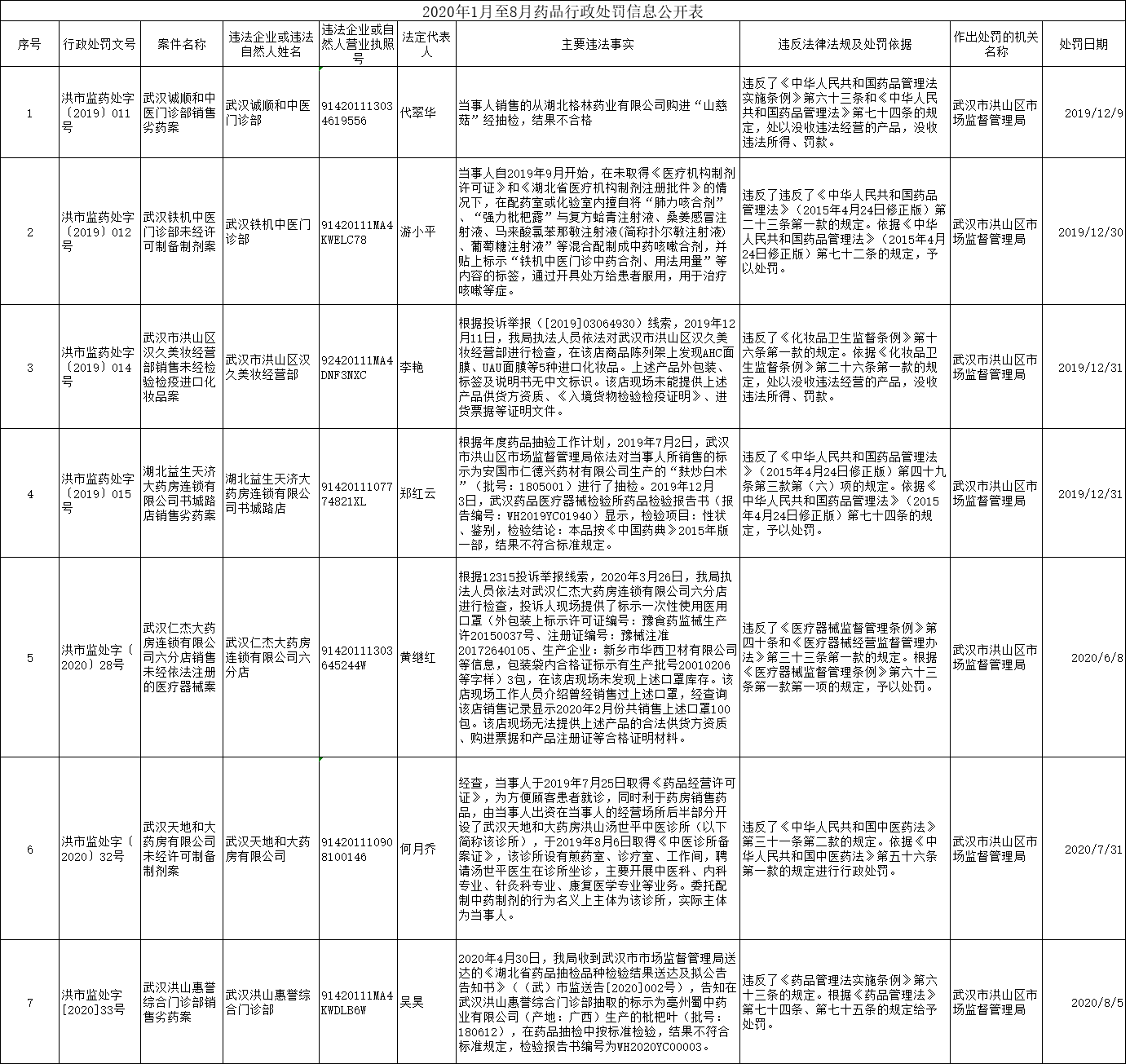标     题 2020年1月至8月药品行政处罚信息公开表