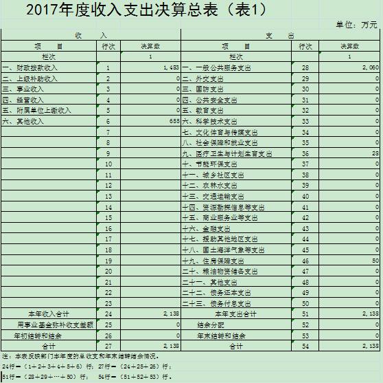 2017年度收、支总计2,138万元。与2016年相比,收、支总计各增加1,234万元,增长137%,主要原因是项目支出预算增加。