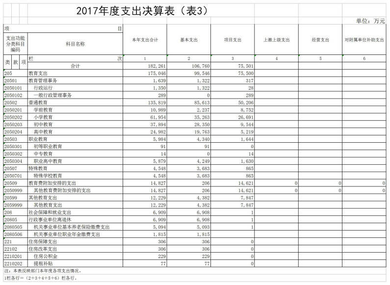 1、教育支出:反映教育行政管理、学前教育、小学教育、初中教育、普通高中教育、普通高等教育等方面的政府教育事业支出。主要为单位日常运行支出以及为完成事业发展目标的项目支出。