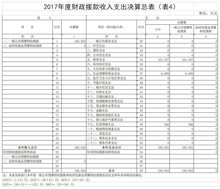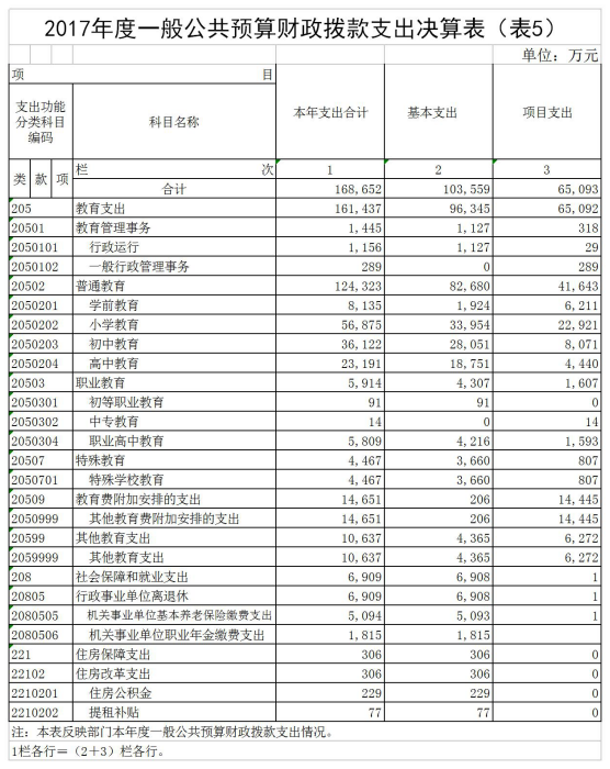 2017年度财政拨款支出168,652万元,主要用于以下方面:教育支出161,437万元,占95.72 %;社会保障和就业支出6,909万元,占4.10 %;住房保障支出306万元,占0.18 %。