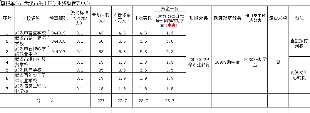 2024年春季学期中等职业学校国家助学金资金分解明细表