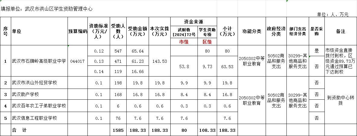 2024年春季学期中等职业学校本市免学费资金分解明细表