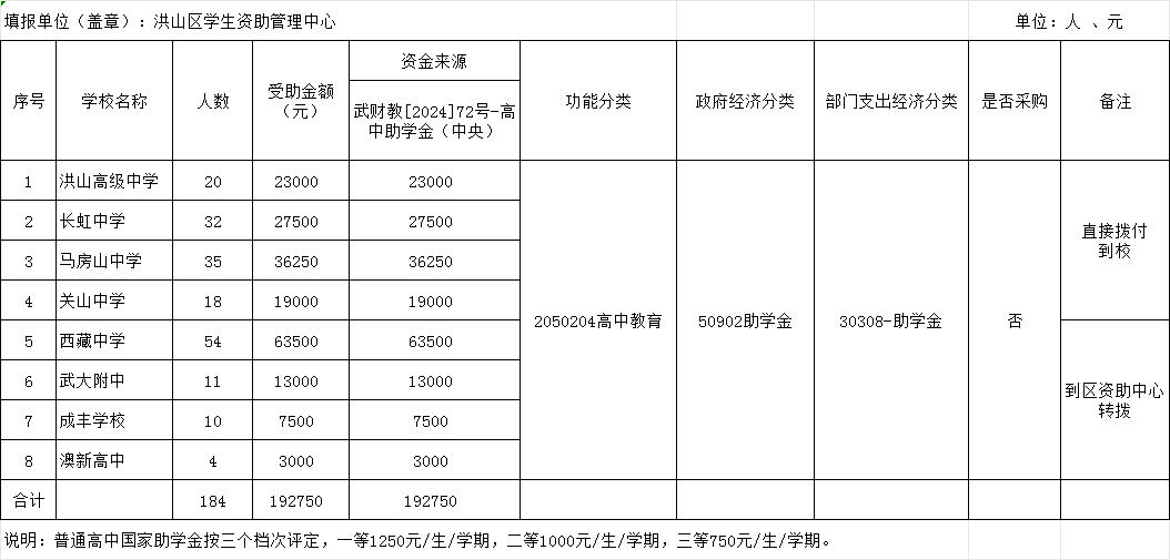 2024年春季学期普通高中国家助学金划拨分解明细表