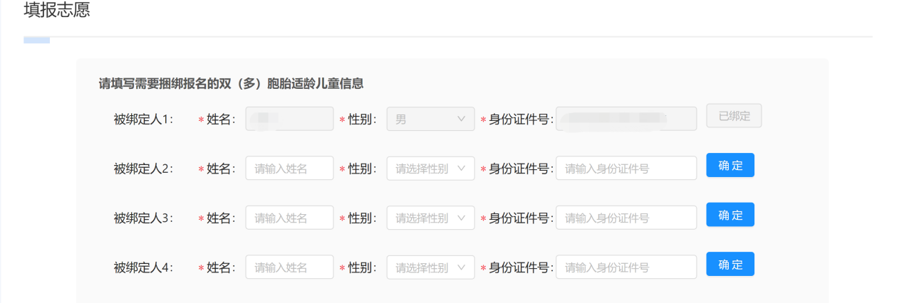上一步骤勾选“是”,点击“下一步”后,请按系统提示填写需要捆绑报名的双(多)胞胎学生信息,只需要填写被捆绑人的姓名、性别、身份证件号(小学)或国网学号(初中),点击“确定”按钮,完成双胞胎捆绑。如果是多胞胎,继续填写下一个被捆绑学生信息,并点击“确定”按钮,直至所有需要捆绑的多胞胎学生都捆绑完成。若信息填写有误,系统将提示无法完成捆绑。