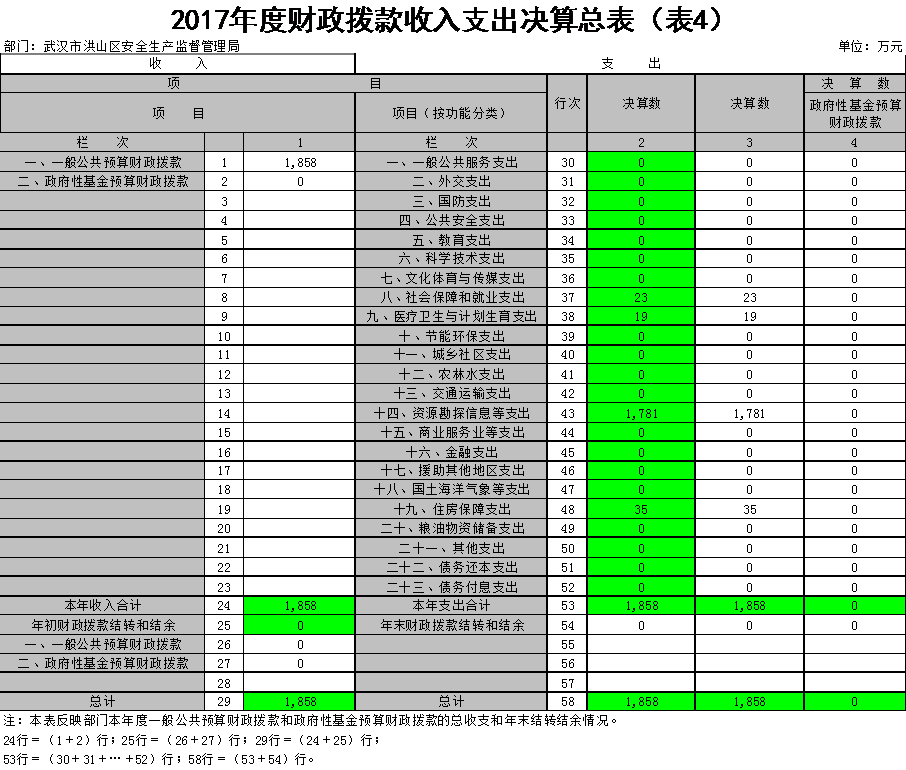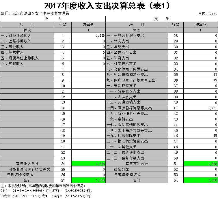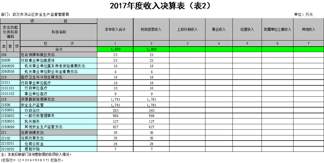 2017年度收、支总计1,858万元。与2016年相比,收、支总计各增加1,064万元,增长134.01%,主要原因是在执行中安排到区直部门827万元区“十年实事”项目下移到安监局支付;行政运行费用增加;项目经费中协管员经费、合同工经费、增加。
