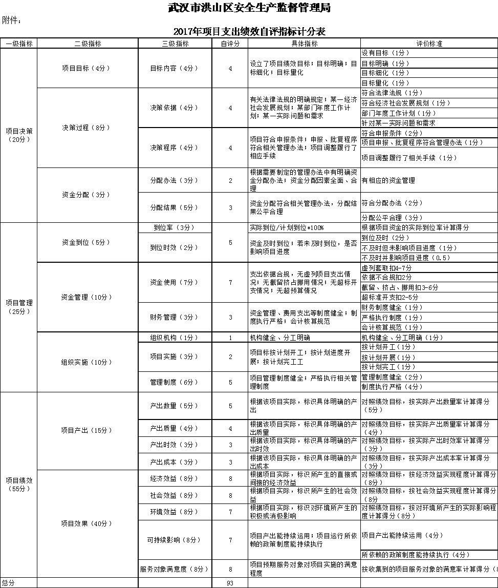 根据预算绩效管理要求,黄色网址 安全生产监督管理局组织对2017年度一般公共预算项目支出全面开展绩效自评,共涉及项目 18 个,资金 1391 万元。组织对 4 个部门(单位)开展整体支出绩效自评,资金 1858 万元。从绩效评价情况来看,区安监局坚决贯彻区委、区政府的决策部署,着眼改革发展稳定大局,认真贯彻国家、省和市安全生产工作会议以及中央省市领导同志关于安全生产工作的重要指示批示精神,深入推进《中共中央国务院关于推进安全生产领域改革发展的意见》落实。紧紧围绕推动发展绩效考核指标,强化组织领导,落实工作责任;健全工作机制,夯实基层基础;突出重点行业领域专项整治,深入推进隐患排查治理和“打非治违”行动,积极持续推动“五方联动”专家问诊;持续加大宣传教育培训力度;高起点、高标准抓好“十件实事”落实,完成了政府“十件实事”承诺的建成40座加油(气体充装)站数字化应急管理室工作圆满完成。安全生产形势持续保持平稳态势,各项考核指示圆满达成。获市政府对区政府安全生产工作责任目标考核“优秀单位”、市安监系统对区安监局绩效目标考核“优秀单位”、区绩效管理综合考评“立功单位”。从评价情况来看,项目立项符合相关管理规定,绩效目标设置合理,评价工作组织程序规范,评级指标体系合理,数据来源可靠,对绩效的反映较为全面准确。
