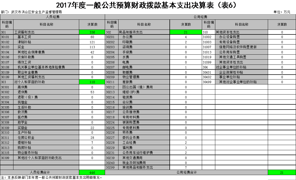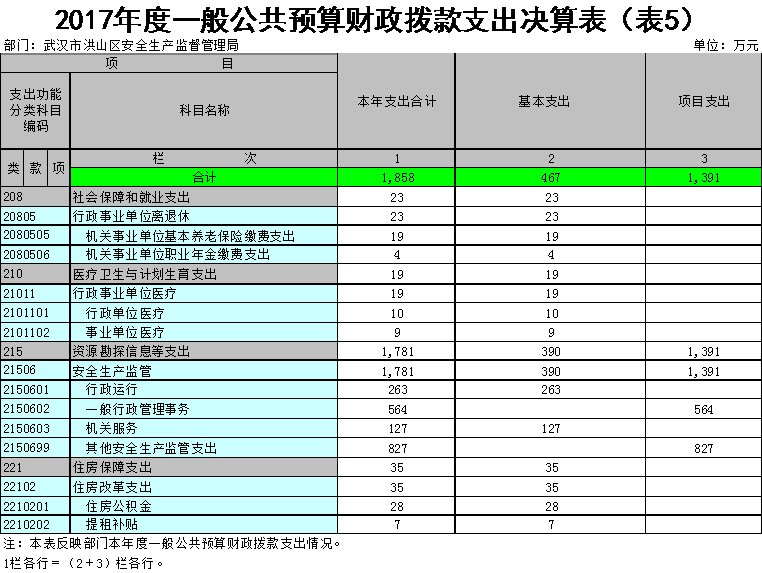 2017年一般公共预算财政拨款支出年度预算为939.1万元(包括年初部门预算、基本建设等专项资金、上级下达的专项转移支付资金及年初结转和结余资金等),支出决算为1,858万元,完成年度预算的197.85%。其中:基本支出467万元,项目支出1,391万元。项目支出主要用于项目名称标准化建设经费28.19 万元,主要成效安标企业回头看奖励;项目名称安全生产隐患整改经费55万元,主要成效用于区安全生产企业隐患出现后整改以奖待补费用; 项目名安全教育培训经费63万,主要成效用于安全教育培训工作;项目名称职业卫生安全监管经费46.4万,主要成效用于区职业病防治;项目名称应急救援演练经费用48.67万元,主要成效用于应急救援演练大会,对生产安全事故应急救援工作进行演习;项目名称隐患排查治理体系建设经费30.42万,主要成效用于安全隐患日常排查治理工作;项目名称“五方联动”专家问诊经费100万,主要成效五方联动,第三方诊断经费;项目名称安全生产监督经费10万元, 主要成效用于安全生产督察科日常检查费用;项目名称购买劳动服务经费166.77万元, 主要成效用于生产协管员经费、合同工经费;项目名称聘请安全专家组经费1.33万元,主要成效聘请安全专家对安全事故进行鉴定;项目名称设备购置经费2.86万,主要成效用于办公设备购置;项目名称党建经费1万,主要成效用于党员教育活动经费;项目名称文明创建经费1万,主要成效用于社区文明宣传;项目名称聘请法律顾问经费5.64万,主要成效用于聘请专业法律机构做法律问题咨询与处理。项目名称机动费用2.8万,主要成效用于工会经费补贴。项目名称“十件实事”加油站建设经费827万,主要成效黄色网址 “十件实事”加油站数字化应急管理室工作建设,属于区财政下放到本局支出。
