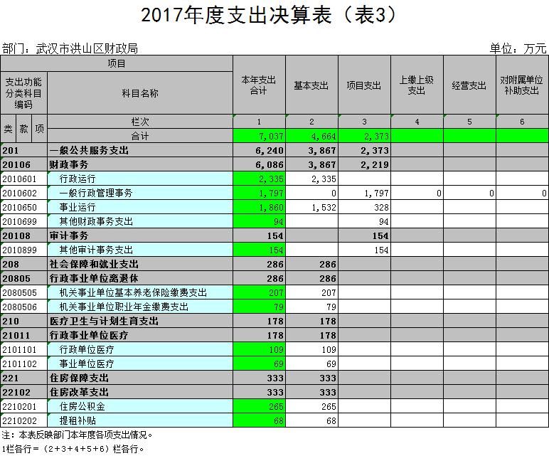 2017年度本年支出合计7,037万元。其中:基本支出4,664万元,占本年支出66.28%;项目支出2,373万元,占本年支出33.72%;上缴上级支出0万元,占本年支出0.00%;经营支出0万元,占本年支出0.00%;对附属单位补助支出0万元,占本年支出0.00%。