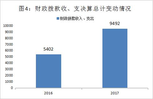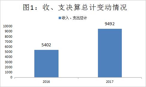 2017年度收、支总计9,492万元。与2016年相比,收、支总计各增加4,090万元,增长75.71%,主要原因一是财政拨款年初结转和结余2898万元,二是基本支出中在职及离退休人员经费增长,三是财政监管任务增加,相关工作经费增加。