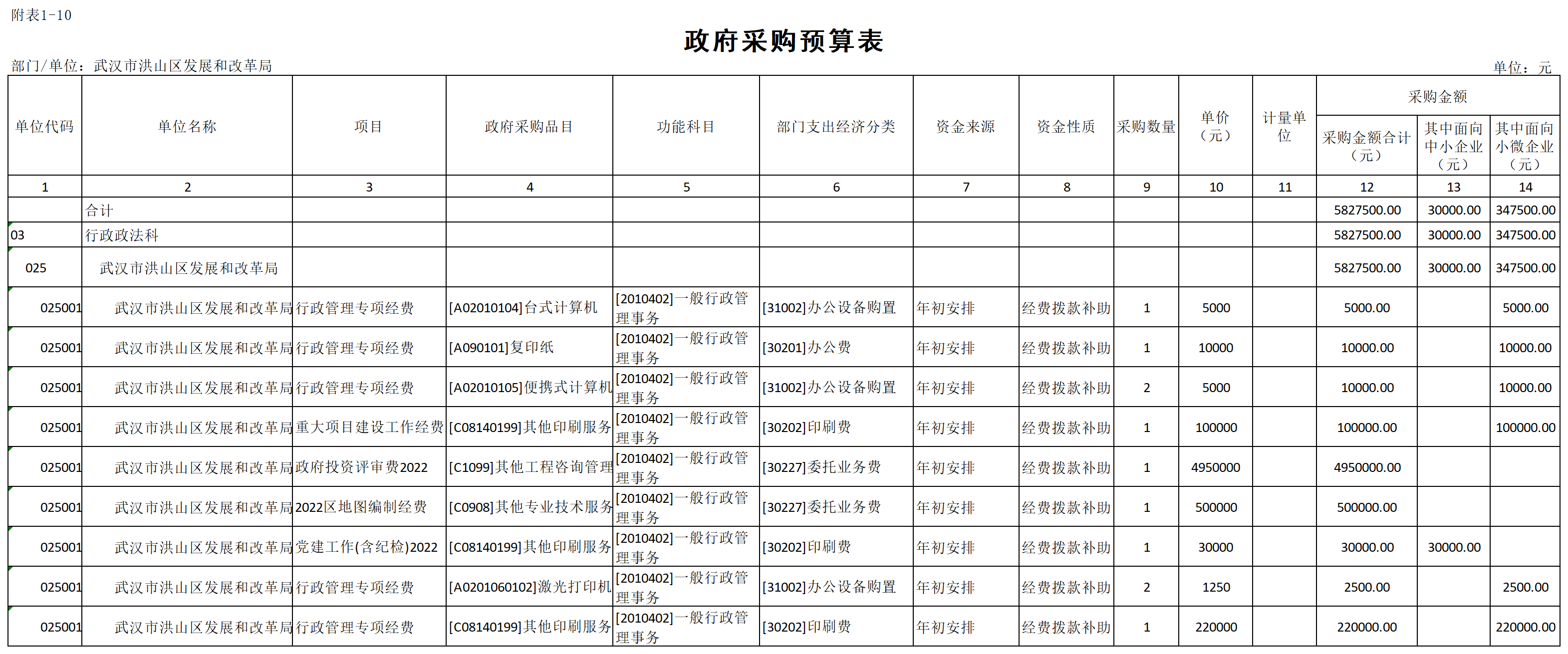 十、政府采购预算表