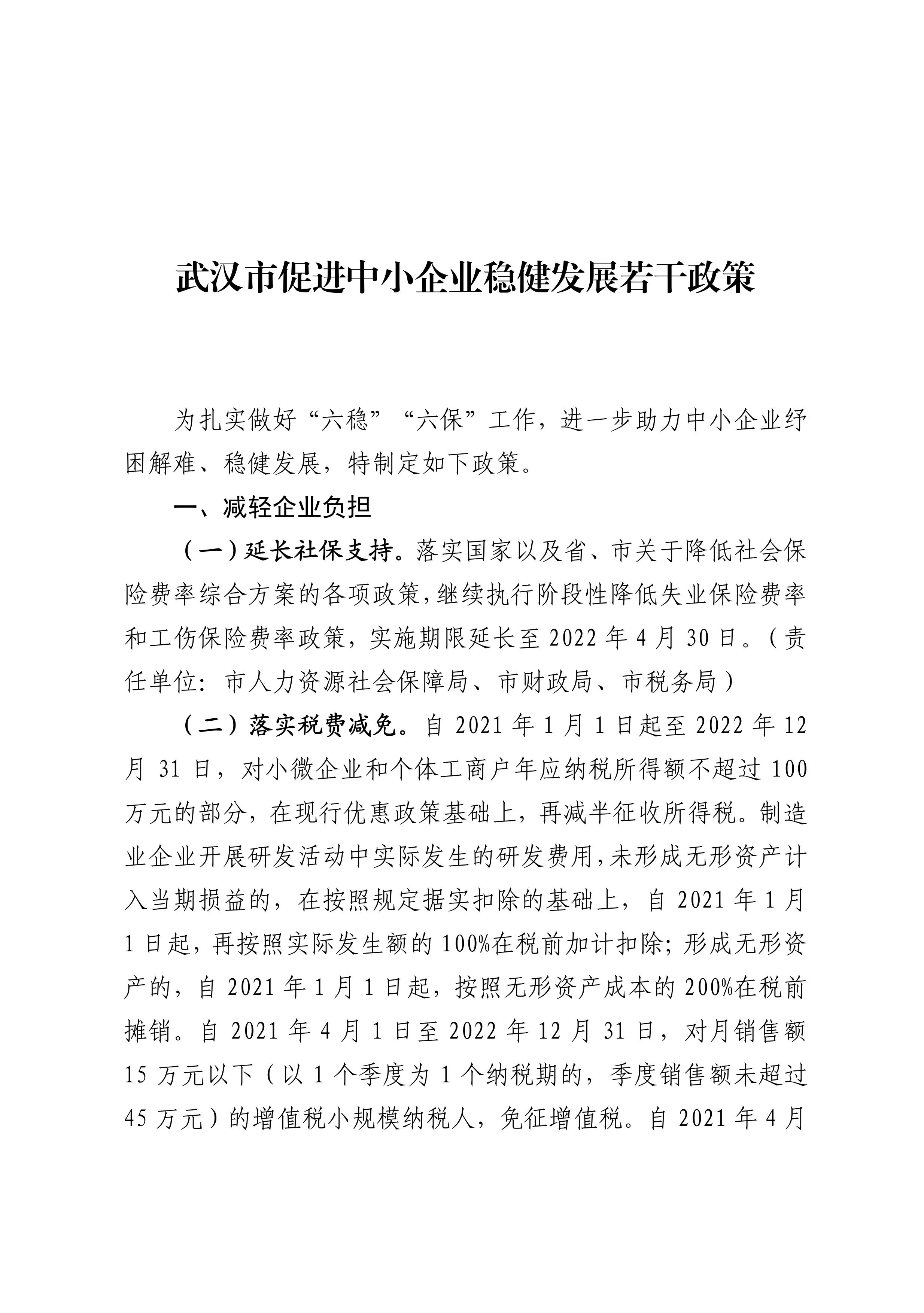 名 称:市人民政府关于印发武汉市促进中小企业稳健发展若干政策的通知