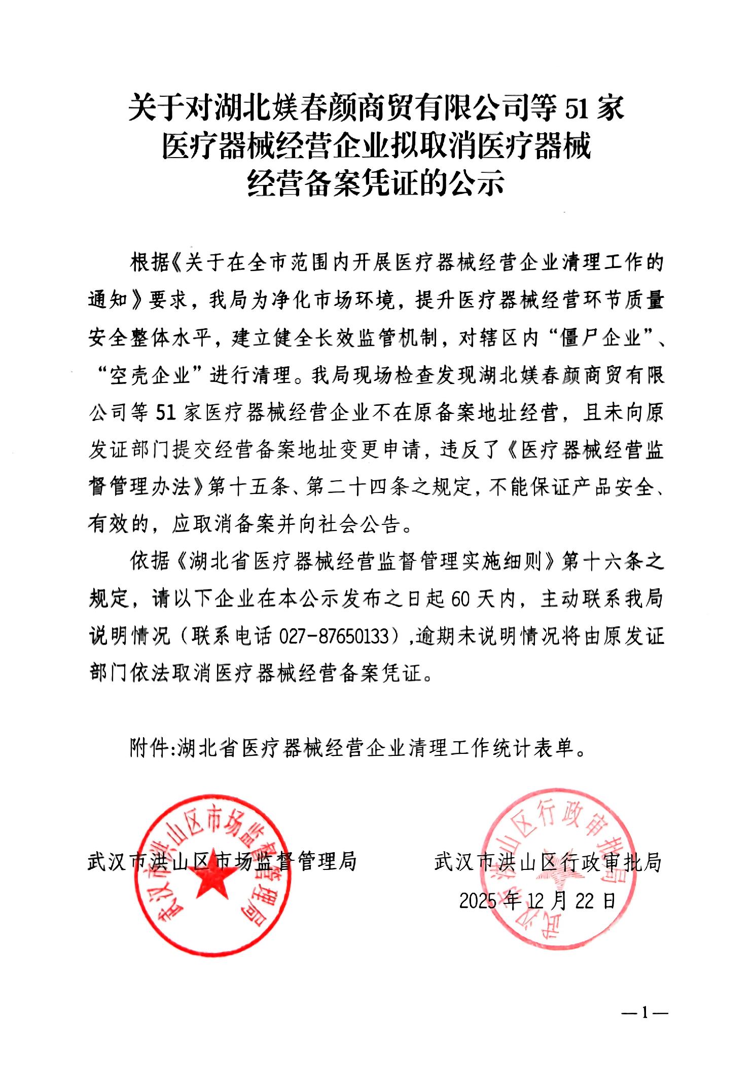 名 称:关于对湖北媄春颜商贸有限公司等51家医疗器械经营企业拟取消医疗器械经营备案凭证的公示