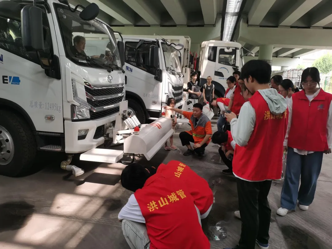 “清扫路面的水是从哪里来的?”“环卫工作量这么大,我们有多少环卫工人呢?”“下雨天还需要洒水作业吗?”13名来自中南财经政法大学的红马甲大学生志愿者纷纷发问,广美城市运维业务部部长胡俊一一向大学生志愿者现场进行解惑。