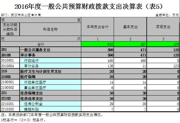 2016年一般公共预算财政拨款支出年度预算为710万元(包括年初部门预算、基本建设等专项资金、上级下达的专项转移支付资金及年初结转和结余资金等),支出决算为 652万元,完成年度预算的91.83%。其中:基本支出527万元,项目支出125万元。项目支出主要用于:区本级预算执行审计4.6万。重点检查预算编制是否科学、合理,预算执行结果是否真实、合法等情况。区地税部门2015年度税收征管情况审计4.7万。重点审查分析税收政策执行、税收征管质量,促进规范税收征管。区直部门预算执行审计5.4万。检查当年收支预算编制是否科学、合理,收支预算执行结果是否真实、合法。重点项目征地拆迁资金跟踪审计7.5万。突出关注宏观政策落实情况,关注工程质量和效益等问题,严肃查处建设领域经济案件。 区委区政府临时交办其他项目审计2.8万。在完成年度审计项目计划的同时,积极完成区委、区政府临时交办其他审计事项。档案省特级复查换证费用3.6万。特级档案管理单位复查换证检查。金审工程培训费及升级费用2.4万。建立“金审工程”,以适应OA审计管理和AO计算机辅助审计的全面实施。局域网、政务网维护费5.8万。确保局域网、政务网、审计专网、光纤通讯网连接畅通。物业水电费9.4万。支付大楼全年物业水电费。市区投资建设项目跟踪审计3.2万。组织市区投资建设项目跟踪审计。购买劳务支出15.8万。临时工作人员全年工资、社保支出。经济责任审计10.9万。组织对街、乡党政领导干部和区直部门单位领导干部进行经济责任审计。区政府投资建设项目审计4.6万。审核工程造价的真实性,程序是否规范、是否存在超规模建设等问题。全区社会保障资金审计4.8万。审查保障对象是否符合保障条件、优惠政策是否贯彻落实到位、资金是否专款专用等问题。武汉市公办中小学2015年度教育收费和资金管理情况审计3.5万。重点检查各项收费项目、标准及程序是否符合教育收费公示制度要求,以进一步加强对中小学教育收费的管理,规范学校收费行为,遏制教育乱收费现象,查处违纪违规问题。城镇保障性安居工程跟踪审计5.5万。审核各类城镇保障性安居工程的保障范围、保障水平、保障规划、准入退出、分配运行等制度的建立健全情况,以及财政、金融、土地等政策执行情况等。政府公共资金审计2.4万。审核政府公共资金规范管理,提高资金使用效益。党建工作经费2.8万。加强党的组织建设、开展各项活动等党建工作。文明创建工作经费2.1万。深入开展省级最佳文明单位创建活动,组织各类学习、宣传活动。后勤保障经费11.7万。工作日全体工作人员的伙食费。稳增长促改革调结构惠民生防风险政策措施落实情况跟踪审计4万。组织稳增长促改革调结构惠民生防风险政策措施落实情况跟踪审计。聘请法律顾问经费3万。聘请法律顾问。精准扶贫工作经费1.5万。组织精准扶贫工作。新常态下黄色网址 经济开发区经济运行情况审计调查3万。组织新常态下黄色网址 经济开发区经济运行情况审计调查。