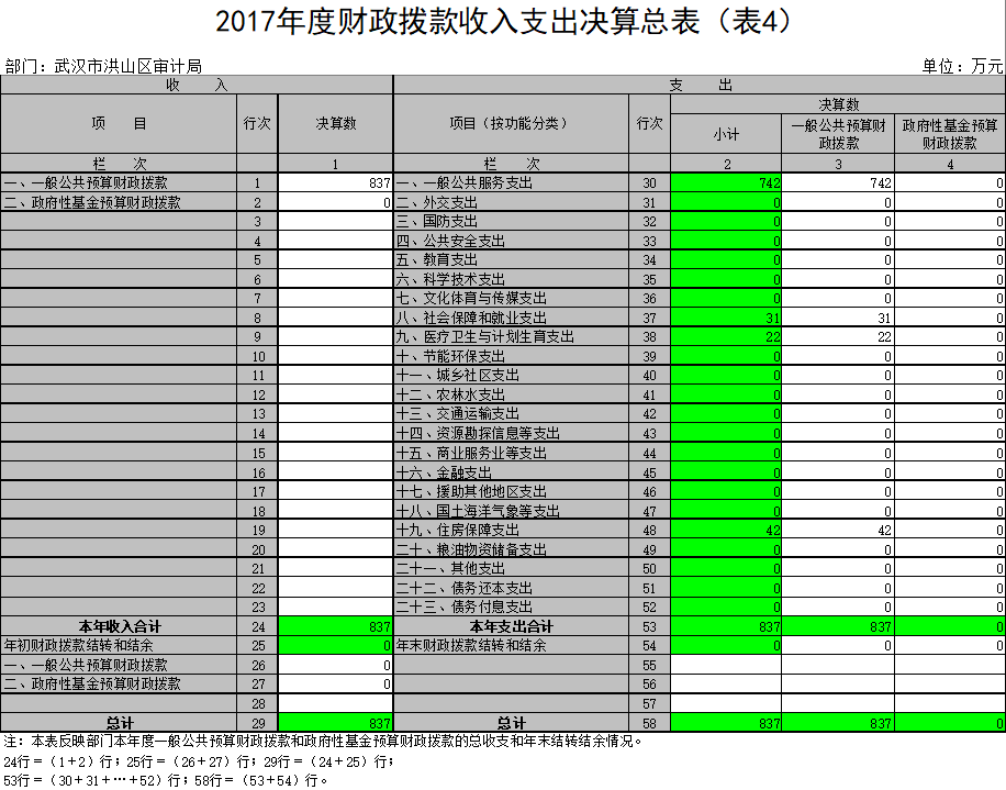 2017年度收、支总计837万元。与2016年相比,收、支总计各增加185万元,增长28%,主要原因是审计任务增加,相关工作经费增加。